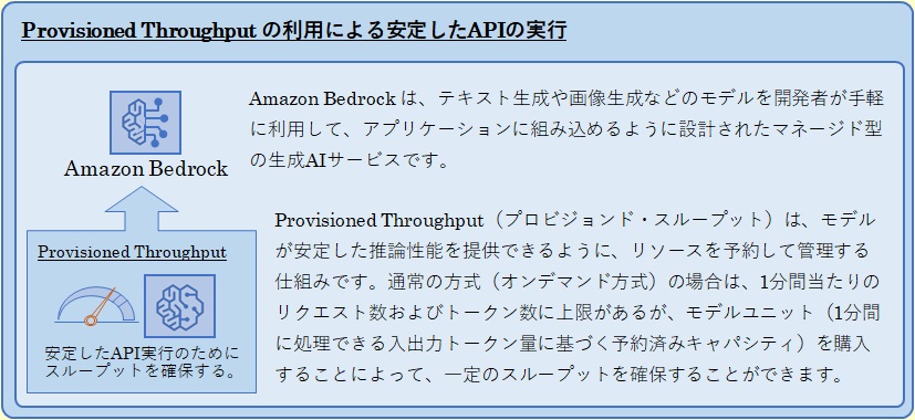 顧客の取引明細を自動で分類するシステムで利用するカスタムモデルを Amazon Bedrock から呼び出して、安定的に推論を実行するために、まず実施する必要があるのは、「カスタムモデルの推論性能を安定させるために専用の処理能力枠を確保する」 ことです。ここでは Amazon Bedrock においてファインチューニングされたカスタム基盤モデルの推論環境を安定的に運用するために、まず実行すべきことが問われていますが、Amazon Bedrock の公式ドキュメントには「カスタムモデルを使用するには、Provisioned Throughput(プロビジョンド・スループット)を購入する必要がある」 と明記されています。これにより推論時に専用のコンピューティング・リソースが確保されて、安定性と低レイテンシーが保証されます。Provisioned Throughput は、モデルが安定した推論性能を提供できるように、リソースを予約して管理する仕組みとなっています。 これにより、必要なリソースを確保して、カスタムモデルを効率的に活用することができるのです。Provisioned Throughput を購入することは、すなわち、専用の処理能力枠を確保することを指しており、これが正しい解答となります。