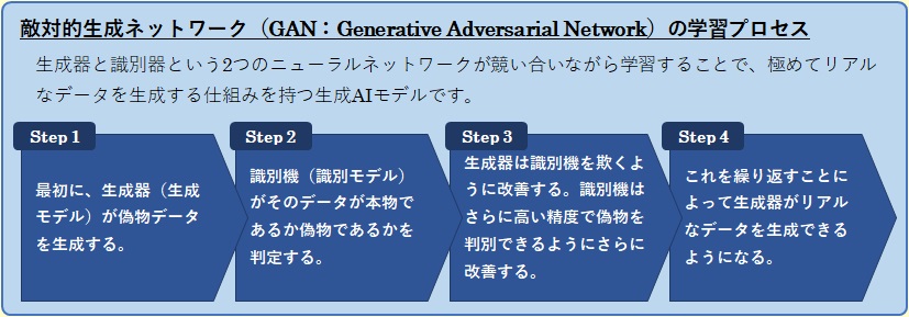 本問題のユースケースにおいて、元の白黒写真の特徴を保持しつつ、自然でリアルな色付けを行うために最も適したモデルは、敵対的生成ネットワーク(GAN:Generative Adversarial Network)です。GANは、生成器と識別器という2つのニューラルネットワークが競い合いながら学習することで、極めてリアルなデータを生成する仕組みを持つ生成AIモデルです。生成器(Generator)は本物のようなデータを作り、識別器(Discriminator)はそれを見破ろうとするため、両者の対立が生成品質を継続的に高める点が特徴です。高品質なデータの生成(画像生成、音声生成など)に有効であり、本問題のケースの他、製品デザインのようなリアルな合成画像を生成するタスクにも適しています。