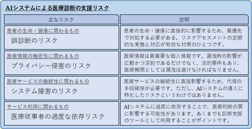 その他の選択肢は、AIシステムの潜在的な問題に対するリスク対策としては不十分です。「AIモデルの出力に対して医療現場からのフィードバックを送信できるようにする」 ことでも、AIモデルの改善に役立つ可能性があります。しかしながら、それ自体はリスクの特定や評価を体系的に行う仕組みではなく、継続的なリスク管理の枠組みとしては不十分です。医療現場からのフィードバックが送信されたとしても、それがどのように分析されて、リスクとして認識されるかは不透明であり、リスク対策としての実効性は限定的です。そのため、この選択肢は補助的な役割にとどまり、最も効果的な手段とはいえません。また、「AIモデルの出力をすべてログに記録して、説明責任を果たせるようにする」 ことについて、ログ記録は、後から診断過程を追跡するための手段であり、事後的な検証や説明責任の確保には有効です。しかしながら、ログの記録や蓄積自体はリスクの特定や評価を能動的に行う仕組みではなく、誤診断の予防には直結しません。リスク対策としては補完的な位置づけであり、潜在的な問題を早期に発見・対処するという観点では不十分です。そして、「モデルを非公開で運用して、外部からの不正アクセスのリスクを制限する」 ことは、AIシステムの運用において外部からの不正アクセスの脅威、すなわち、情報セキュリティ上のリスクへの対策を意図したものとなっています。確かに、医療情報の保護やシステムの安全性確保という観点では重要な施策ですが、設問で問われているAIシステムの潜在的な問題への対策の意図とは合致しません。