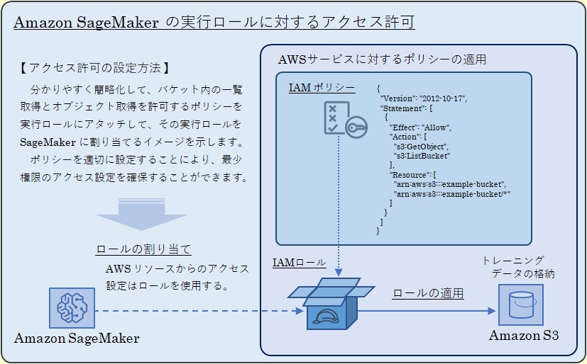 AWSの最小権限の原則に従って必要なアクセス権限だけを付与するよう求められている場合に、Amazon SageMaker のトレーニングジョブが Amazon S3 バケット内のデータを読み取るための最も適切なアクセス制御方法は、「Amazon SageMaker サービスのIAM実行ロールに Amazon S3 バケットへの必要最小限のアクセス権限を付与する」 ことです。この Amazon SageMaker は機械学習(ML:Machine Learning)モデルの構築からトレーニング、デプロイ、運用までを一貫して実行できるプラットフォームを提供するマネージド型のMLサービスです。下図にイメージを示すように、Amazon SageMaker の実行ロール(IAMロール)に必要なアクセスのみを許可することで、最小権限でのアクセスを確保することができます。IAM (Identity and Access Management) は、安全にAWS操作を実施するための認証・認可の仕組みを提供するマネージド型のサービスであり、主な構成要素として、IAMユーザー、IAMグループ、IAMポリシー、IAMロールがあります。SageMaker のトレーニングジョブが実行されるときにはIAMロールを引き受けて、そのロールに設定された権限を使って Amazon S3 バケットのデータにアクセスします。そのため、S3のデータを安全に利用するには、このロールに対象バケットのデータを読み取るために必要な操作だけ許可するIAMポリシーをSageMakerに対して付与することが最も適切なアクセス制御方法となります。
