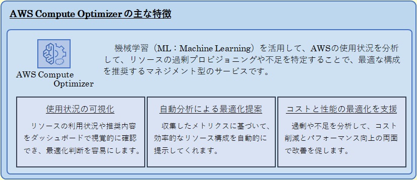 機械学習(ML:Machine Learning)を活用して、最適なインスタンスタイプを自動的に推奨できるサービスは、AWS Compute Optimizer です。AWS Compute Optimizer は、MLを活用して、AWSの使用状況を分析して、リソースの過剰プロビジョニングや不足を特定することで、最適な構成を推奨するマネジメント型のサービスです。これにより、利用者は複雑な設定を手動で調整する手間を省き、クラウドリソースのパフォーマンス向上と効率的な運用を実現できます。具体的には、MLを利用して Amazon EC2 インスタンスのCPUやメモリー、ネットワーク使用状況に加えて、Auto Scaling グループや、Amazon EBS、AWS Lambda 関数のメトリクスも継続的に分析します。これらのデータに基づいて、より適切なインスタンスタイプやリソース構成を自動的に推奨します。専門知識がなくても利用状況を可視化でき、安心して最適化を始められる点も利用者にとって大きな利点です。