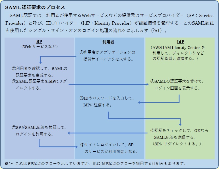 利用者が、既存のディレクトリ認証情報(SAML 2.0)を使ってサインインして、シングル・サイン・オンでリソースにアクセスするようなアプリケーション連携の仕組みを構築したい場合に、採用するべきサービスは、AWS IAM Identity Center です。AWS IAM Identity Center(旧 AWS Single Sign-On)は、複数の AWS アカウントやクラウド・アプリケーションに対して、統合的な認証・アクセス管理を提供するマネージド型のサービスです。SAML(Security Assertion Markup Language)2.0 や OIDC(Open ID Connect)ベースのフェデレーション接続をサポートして、ディレクトリ認証情報によるシングル・サイン・オン(SSO:Single Sign-On)の環境を簡単に構築できます。例えば、企業内の Microsoft AD とフェデレーション接続することで、ADのユーザーを用いたSSOが可能となります。フェデレーション接続とは、異なる認証システム間でユーザーの認証情報を共有して、ログインや認可を可能にする仕組みであり、SSOは 1回のログイン操作で複数のシステムやサービスにアクセスできる認証の仕組みです。利用者は、ディレクトリの認証情報を使ってAWSにサインインすることができるため、ディレクトリの認証情報と連携したリソースにシームレスにアクセスできます。