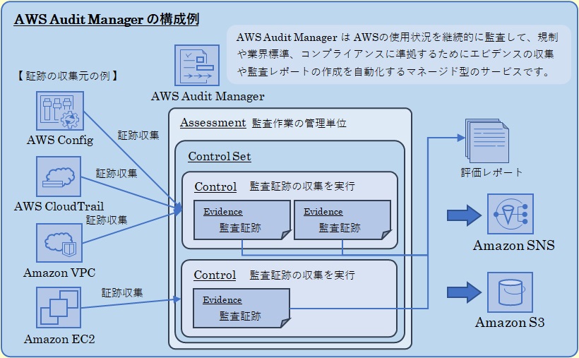監査対応の効率化を図るために、AWSリソースの操作履歴や設定変更などの情報を自動的に収集・整理して、評価レポートとして活用することができるサービスは、AWS Audit Manager です。AWS Audit Manager は、AWS の使用状況を継続的に監査して、規制・業界標準・コンプライアンスに準拠するためにエビデンスの収集や監査レポートの作成を自動化するマネージド型のサービスです。AWS Audit Manager は、あらかじめ定義されたフレームワークに基づいて、ポリシーや手順、運用活動(コントロール)に関する証拠を自動的に収集して、それらが適切に実施されているかを評価する仕組みを提供します。このサービスを利用することで、規制要件や業界標準に対する準拠状況を可視化して、監査準備にかかる時間と手間を大幅に削減できます。AWSのセキュリティおよびコンプライアンス機能の中でも、監査証跡の収集と評価の自動化に特化しており、AWS CloudTrail や AWS Config などの他のサービスのログ情報と連携することで、より高度な監査対応を実現することができます。