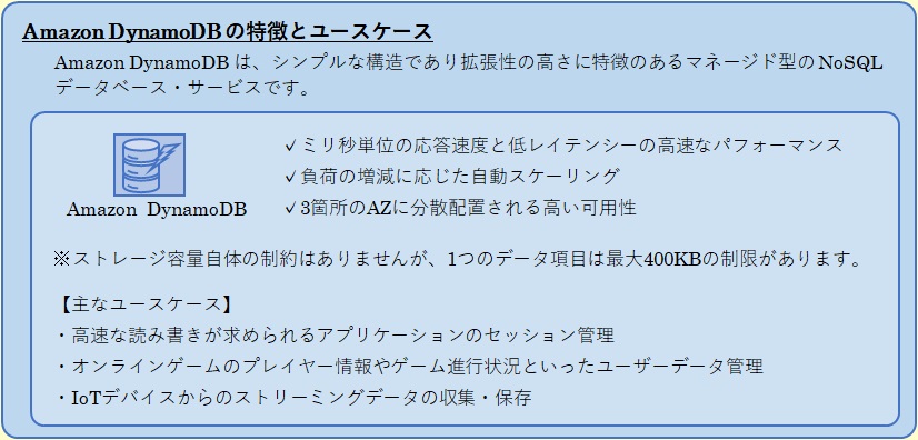 NoSQLデータベースには、キー・バリュー型、ドキュメント・データベース、インメモリ・データストアといったように様々な実装方式があります。AWSではここに挙げた各々の方式に対応したマネージド・サービスのラインナップがあり、キー・バリュー型のマネージド・サービスとして提供されているものが、Amazon DynamoDB です。
